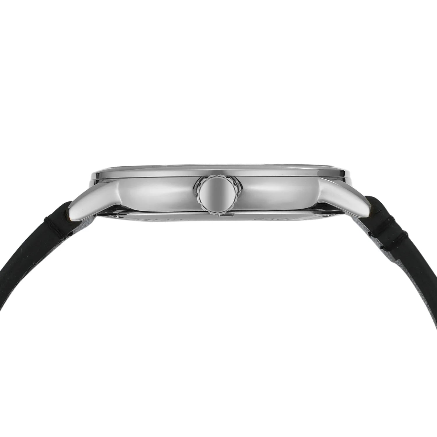 Caixa em aço inoxidável polido, mostrador de leitura minimalista e pulseira em couro legítimo que transmite elegância e elegância.
